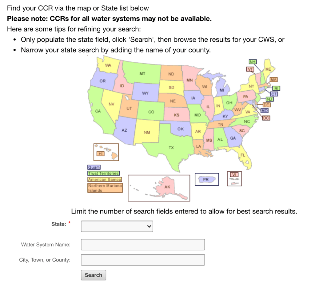A geographical database of CCRs created and published in compliance with the EPA’s CCR rule that requires public water systems to annually evaluate and explain to the public the condition of local drinking water. These reports include sources of drinking water, contamination risks, harmful and regulated substances identified in the water, violations of EPA health standards, and any steps taken to clean drinking water. CCRs are mailed to consumers of local drinking water systems each summer. If a report is not listed in the database, it is best to contact the water system directly.