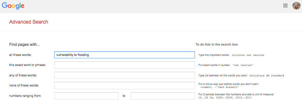 - I searched for “Vulnerability to Flooding” in Google’s advanced search and specified “United States” as the region and .org; .gov; and .edu as the domain.