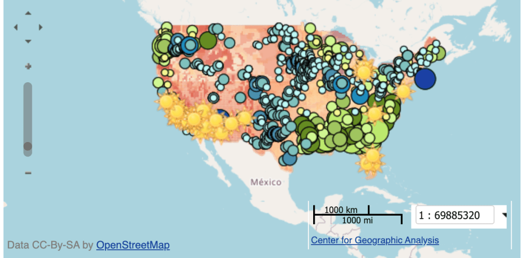 Harvard published an interactive map which illustrates the potential energy gradient from sun, wind, and biomass across the U.S within the lower 48 states. It also includes existing or proposed infrastructure to support energy production processes, namely pulp mills, wind farms, and “large solar array facilities”.